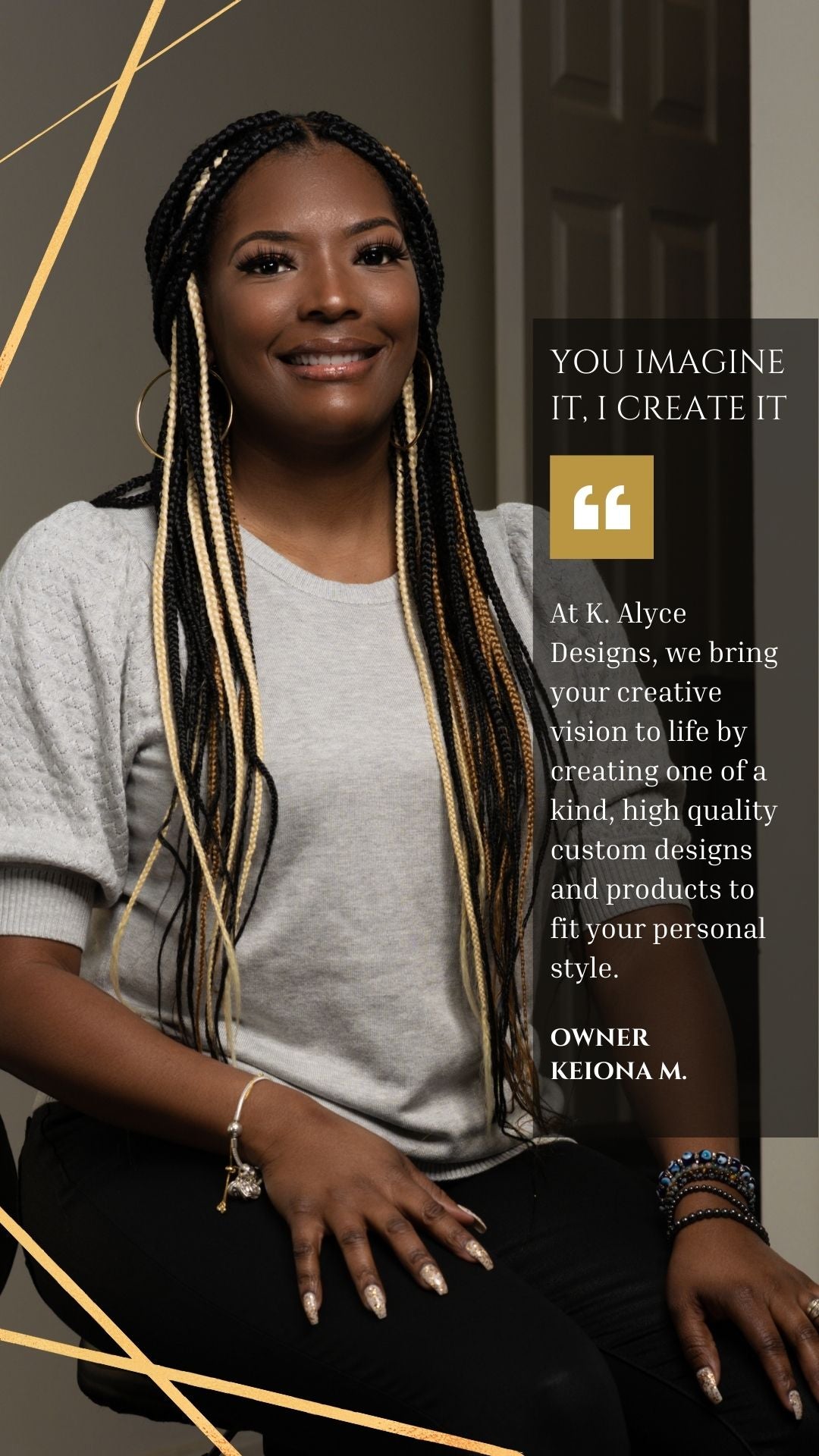 K.Alyce Designs was formed with the passion to inspire and bring forth a presence of great quality, feel good products that are unique and trendy. No job is too big or too small. You imagine it, we create it!